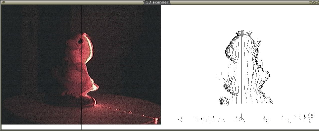 I developped my own software which drives the stepper motor, grabs image from the camera and extracts the points. Here is a screen shot of the first version with one camera. The image on the top is a screenshot of the full points created from the little duck.